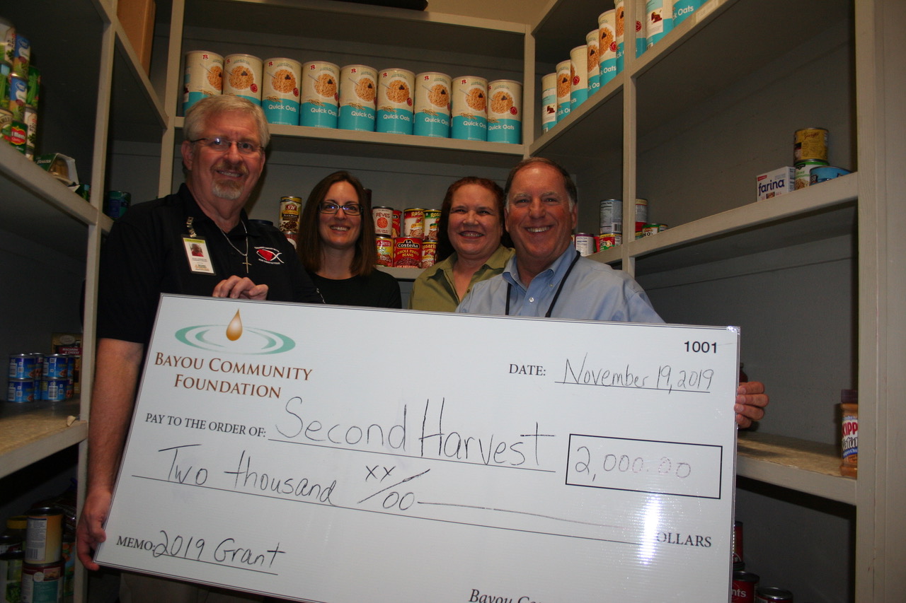 “As our local economy struggles, we are seeing a growing need among local families for basic, nutritious meals that many of us take for granted every day,” said BCF President Stephen Peltier. “Bayou Community Foundation works to identify and address the critical needs of our area, and food security has risen to be one of the highest priorities. We are pleased to award this grant to Second Harvest to help these local food banks feed children and families right here at home, and we thank the BCF donors who make this grant possible.”