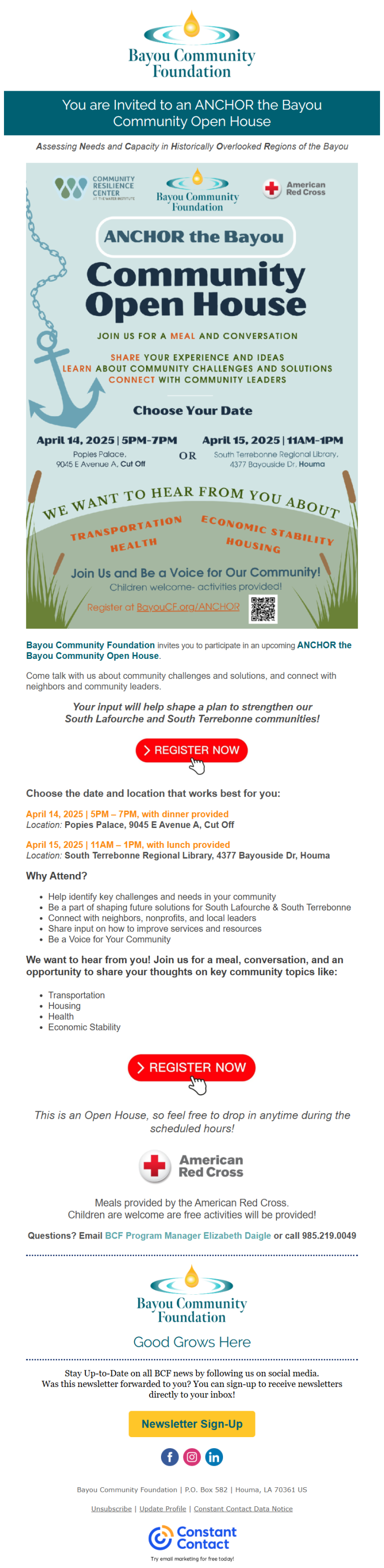 BCF Invites You to an ANCHOR the Bayou Community Open HouseBy Bayou Community Foundation / March 24, 2025 Click HERE or on the image below to read full newsletter.