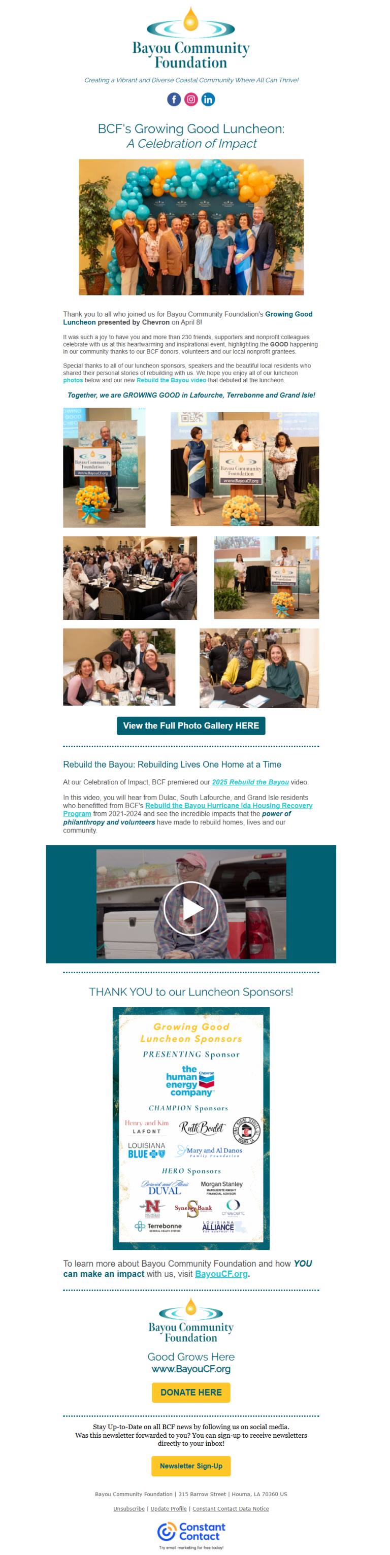 BCF’s Growing Good Luncheon: A Celebration of ImpactBy Bayou Community Foundation / April 17, 2025 Click HERE or on the image below to read full newsletter.
