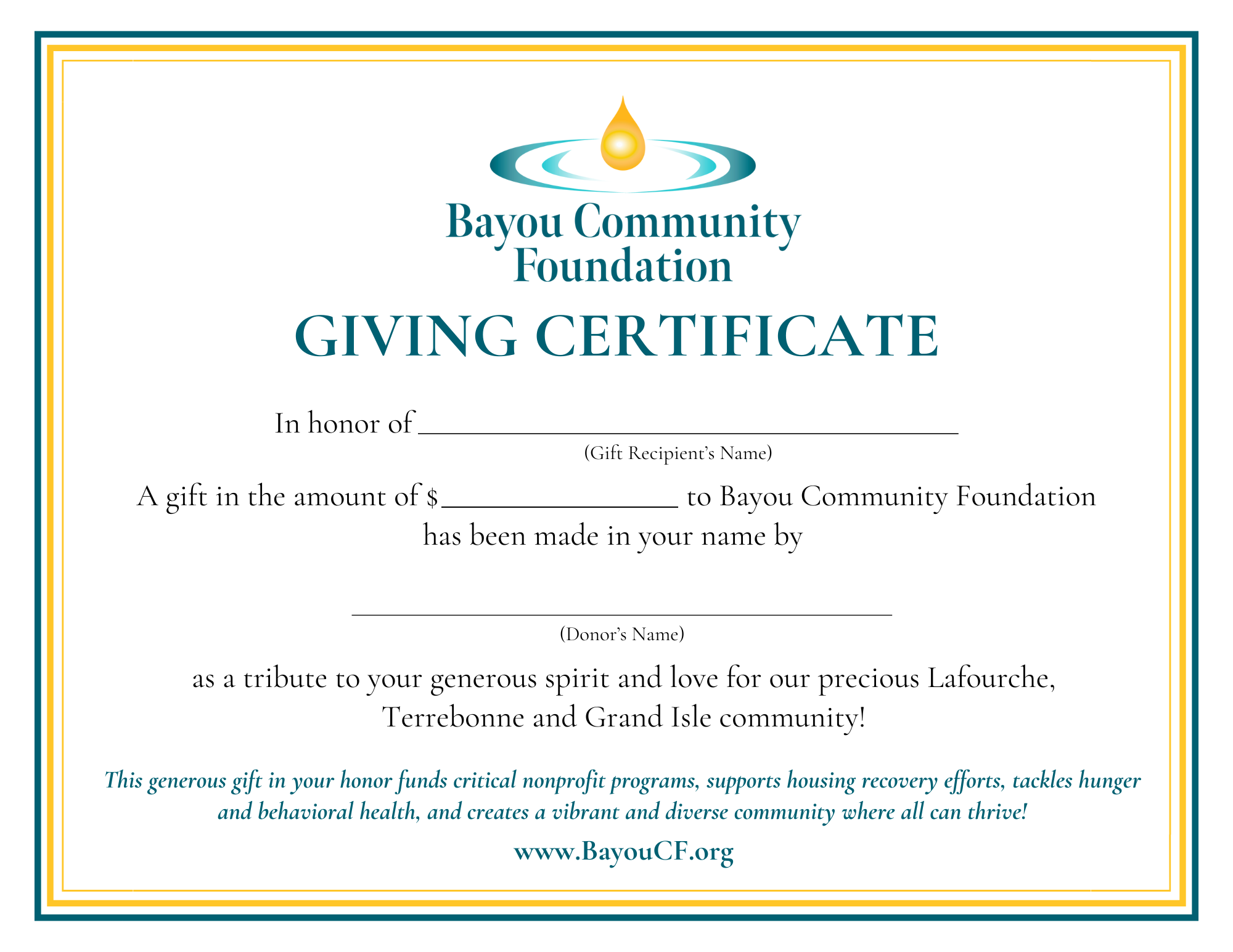 Donate to BCF in honor of a loved one, friend, or associate, then print out a Giving Certificate for them as a tribute to their generous spirit and passion for our Bayou Region. Your gift in their honor will keep on giving long past that special day to fund grants and workshops for local nonprofits, build our Bayou Recovery Fund, and other important work.