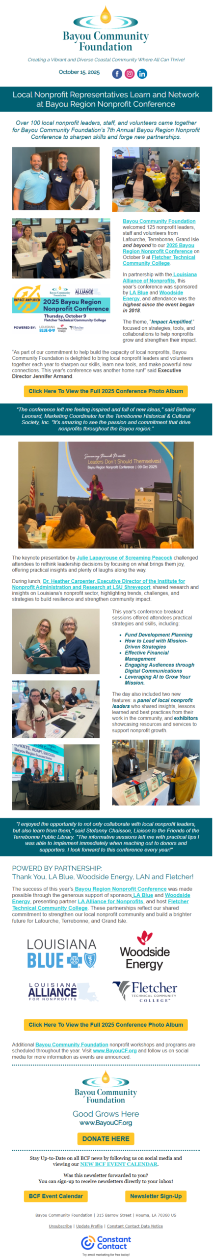 Local Nonprofit Representatives Learn and Network at Bayou Region Nonprofit ConferenceBy Bayou Community Foundation / October 17, 2025 Click HERE or on the image below to read full newsletter.